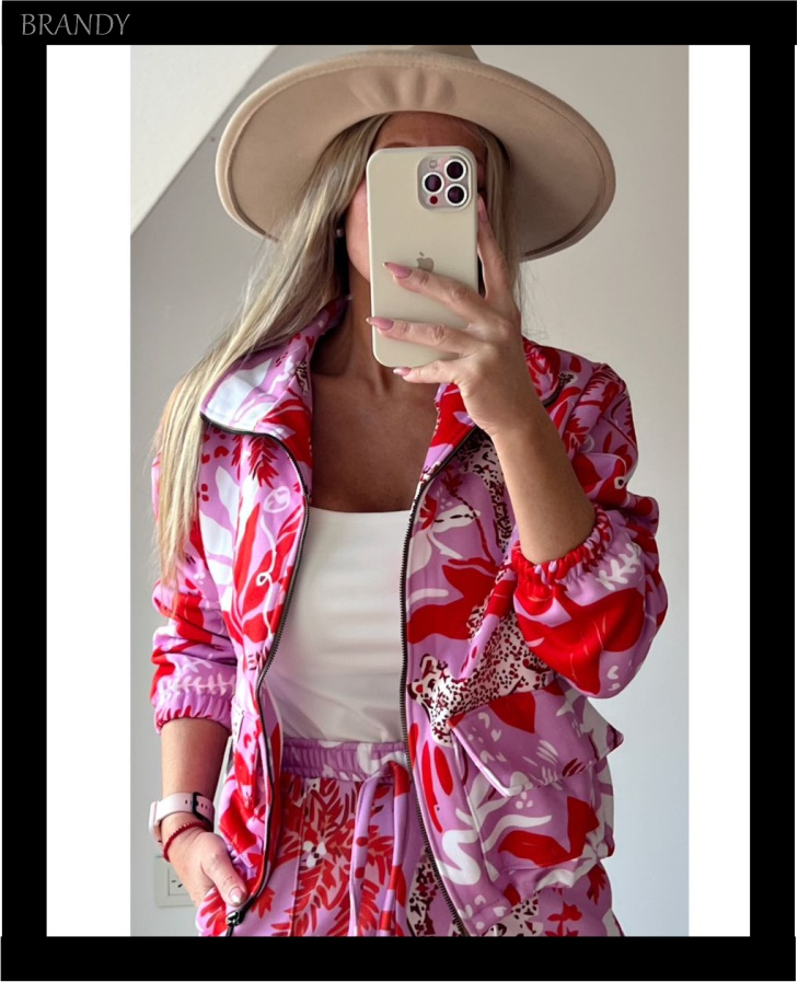 Campera de algodón frisado, con cierre, cuello alto y cordón regulable en la cintura.