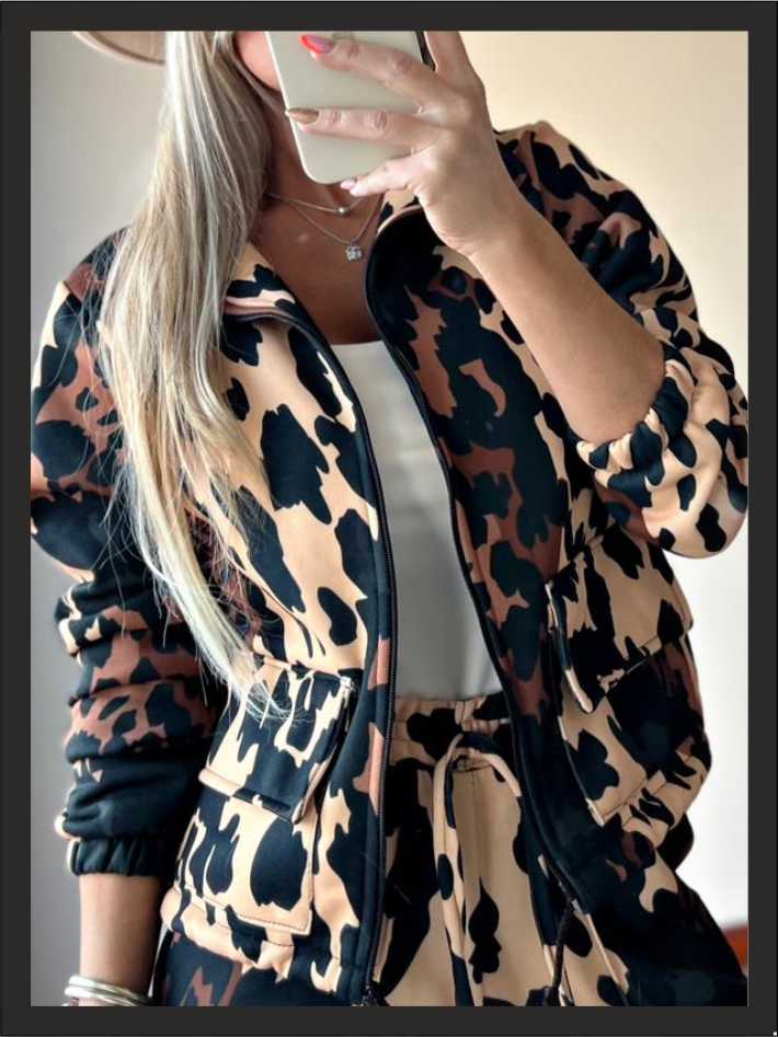 Campera de algodón frisado, con cierre, cuello alto y cordón regulable en la cintura.