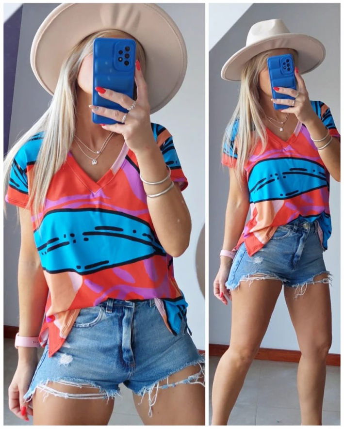 Remera estampada, confeccionada en algodón liviano, posee cuello en v.