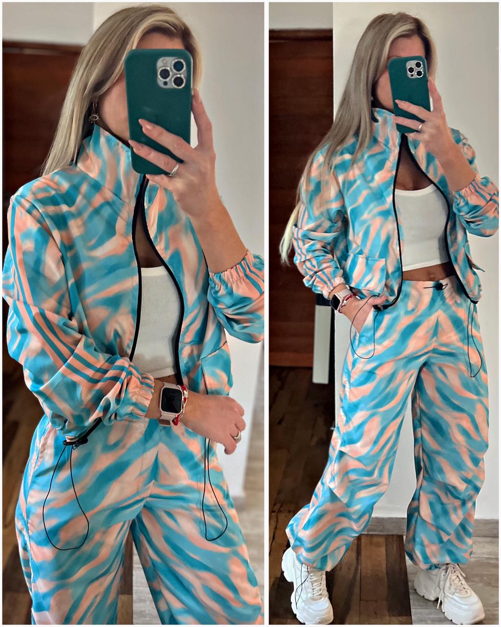 Conjunto de tela rompeviento importada, babucha y campera rompeviento con sistema ajustable en botamanga y cintura del pantalón. Campera ajustable en cintura, con bolsillos.