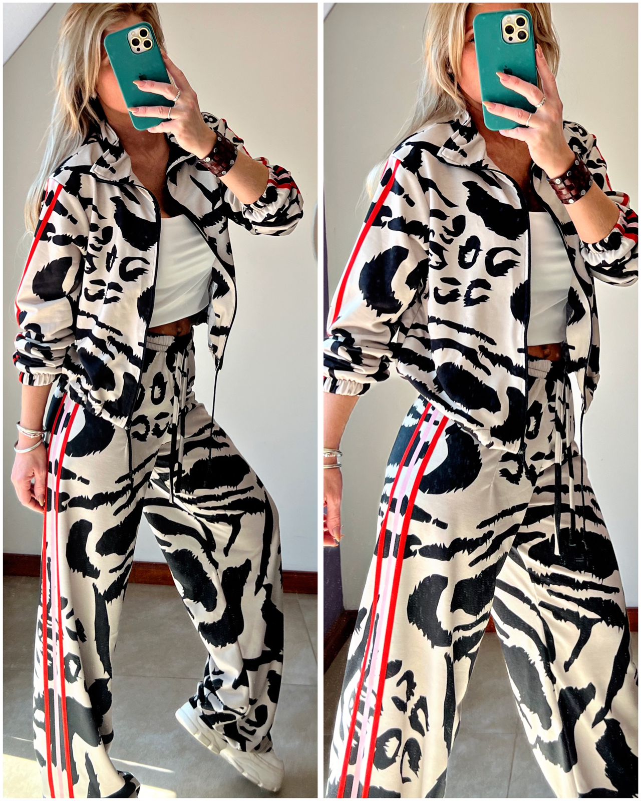 Conjunto de algodón frisado, consta de un palazo elastizado con elástico en la cintura y cordón (el mismo no es regulable) + campera corte a la cintura con cierre, cuello alto y cordón regulable en la cintura, sin bolsillo