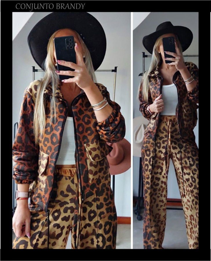 Conjunto de algodón frisado, compuesto por maxi palazo con elástico y lazo + campera con cierre, cuello alto, cordón regulable en la cintura y bolsillo falso