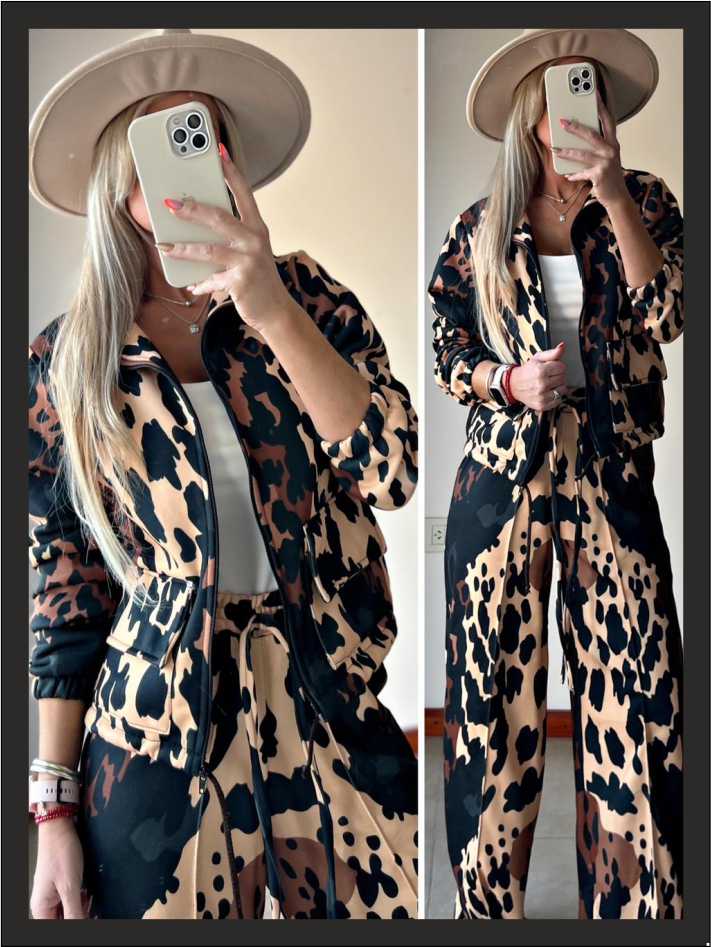 Conjunto de algodón frisado, compuesto por maxi palazo con elástico y lazo + campera con cierre, cuello alto, cordón regulable en la cintura y bolsillo falso