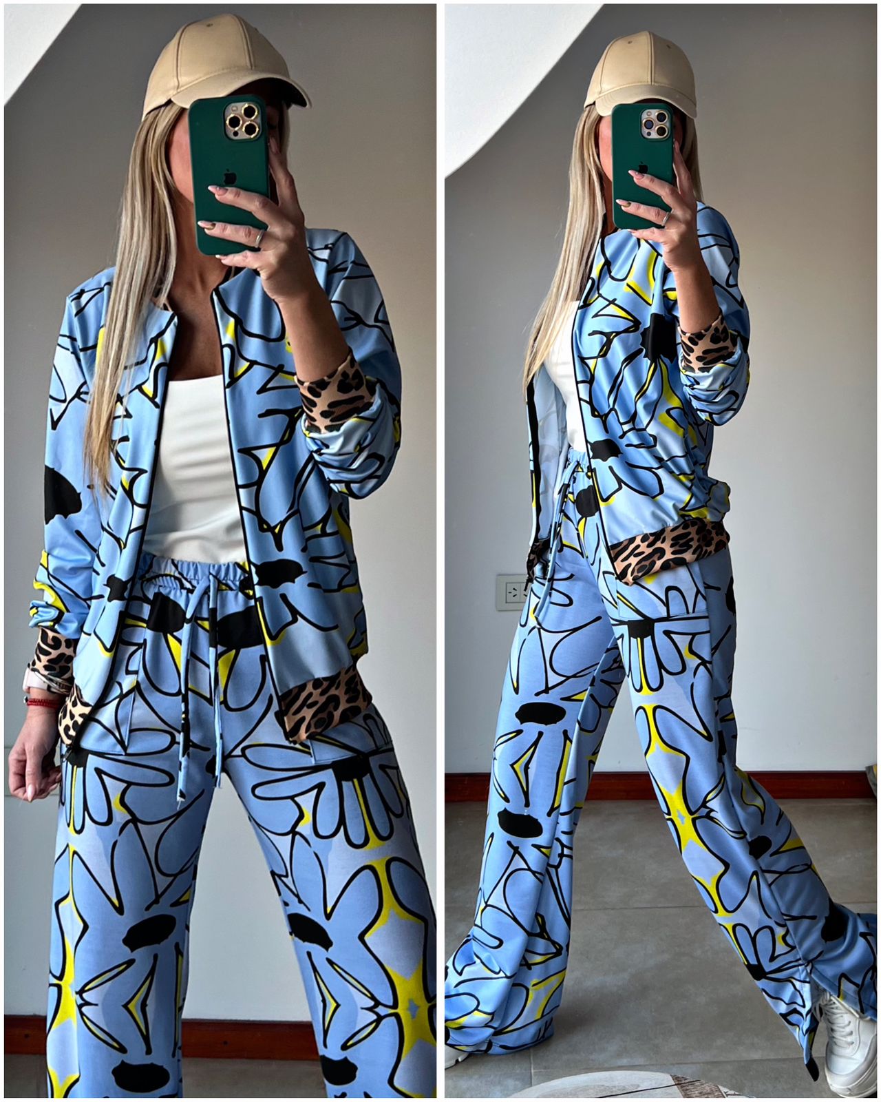 Conjunto que consta de campera de lycra y elastano con cierre, terminación de Ribs en puños, cuello y cintura y un palazo de algodon rustico elastizado con elástico en la cintura y cordón (el mismo no es regulable).