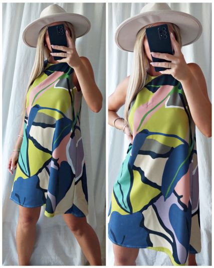 Vestido de microfibra importada sin mangas, de corte evasé y escote redondo